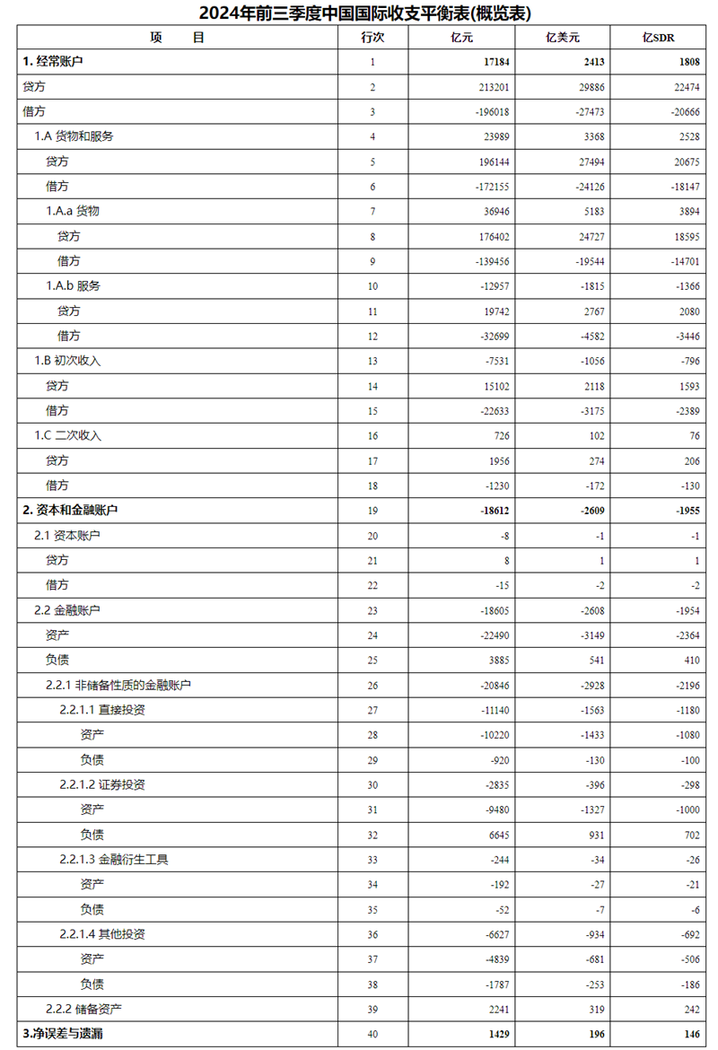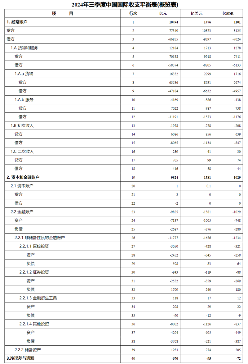 2。“贷方”按正值列示,“借方”按负值列示,差额等于“贷方”加上“借方”。本表除标注“贷方”和“借方”的项目外,其他项目均指差额。3。季度人平易近币计值的国际出入均衡表数据,由当季以美元计值的国际出入均衡表,通过当季人平易近币对美元平均汇率两头价折算获得,季度累计的人平易近币计值的国际出入均衡表由单季人平易近币计值数据累加获得。4。季度SDR计值的国际出入均衡表数据,由当季以美元计值的国际出入均衡表,季度累计的SDR计值的国际出入均衡表由单季SDR计值数据累加获得。5。2024年前三季度。