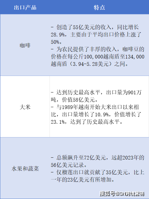 农业部分是越南出口增加的环节鞭策力。虽然面对天然灾祸、风行病和全球市场波动等挑和,2024年农林渔业出口仍达到624亿美元,同比增加18。5%。